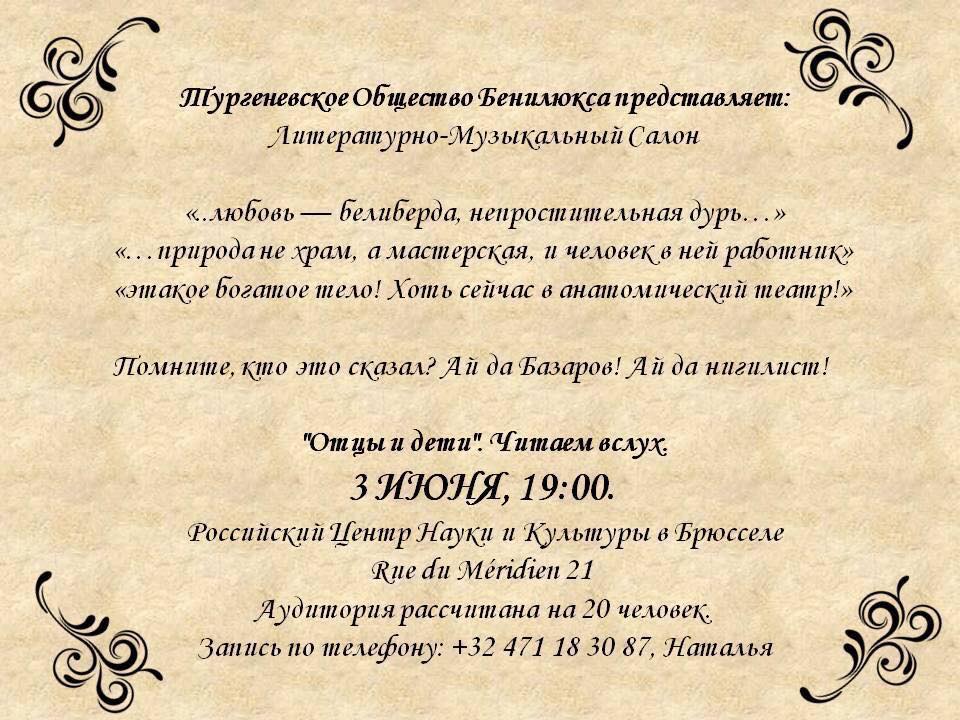 Режиссёр Авдотья Смирнова, Россия, 2008 Бельгийское Тургеневское Общество Бенилюкса представляет Идею экранизации « Отцов и детей » Авдотья Смирнова вынашивала семь лет. По её мнению, это едва ли не самый непонятый русский роман. Это произведение о любви и жизни, а не о нигилизме и разрезанных лягушках[1]. « Я очень люблю этот роман и очень часто его перечитываю, всю свою жизнь. И очень его люблю. Я считаю, что у этого романа очень несчастливая судьба. Этот роман, может быть, самый непрочитанный роман в русской классике. С того момента, как он вышел и вокруг него начались споры и скандалы, которые, собственно, привели Тургенева в эмиграцию, этот роман был прочитан и понят как идеологический. А этот роман вообще-то антиидеологический; это роман про то, что любая идеология перед лицом живой жизни и её высшего проявления — любви — терпит фиаско. Это роман о любви. Просто ему очень не повезло. И в XIX веке его мало кто понял. Хотя умные люди прекрасно все поняли: Чехов обожал этот роман[2] ».